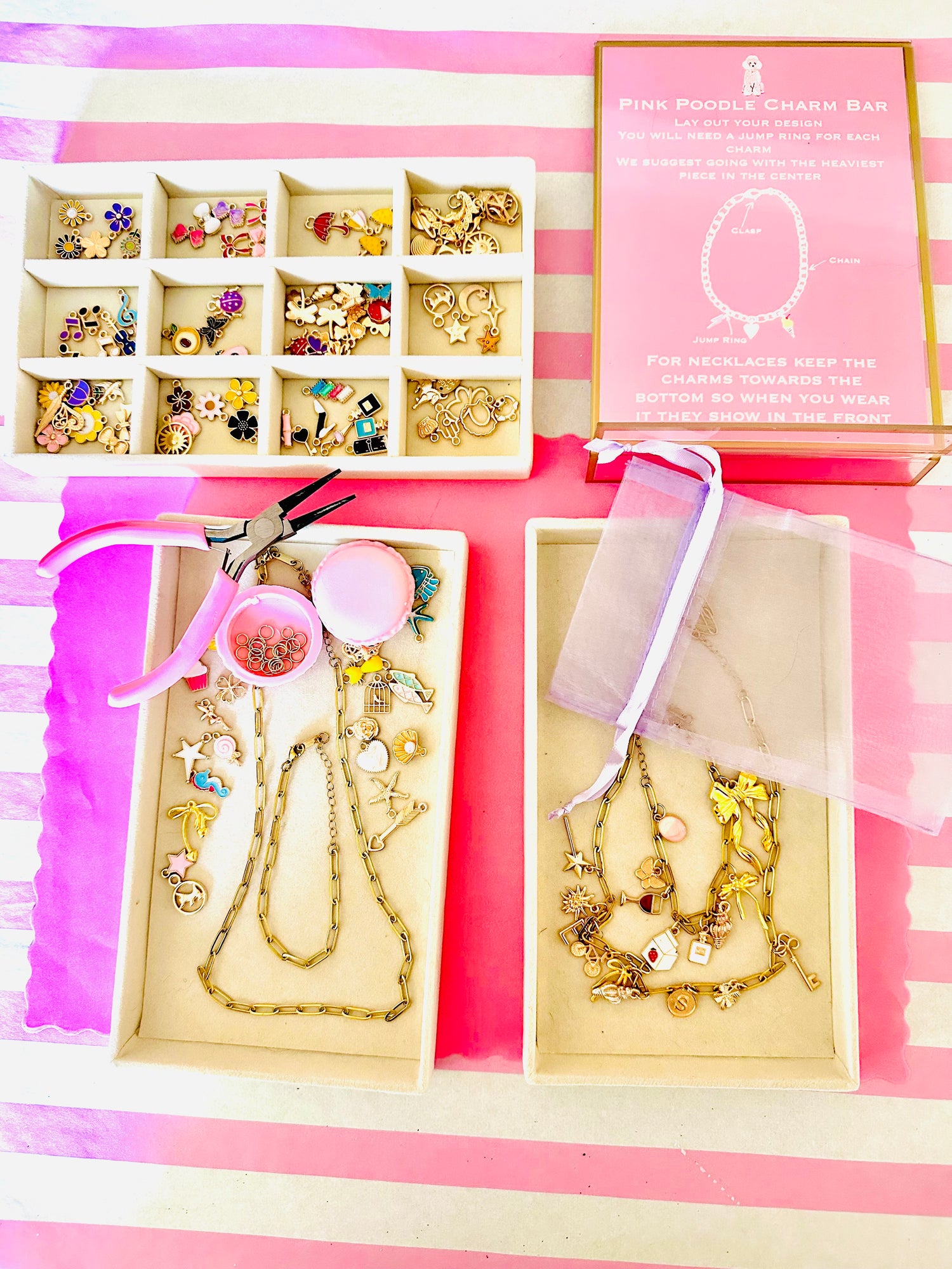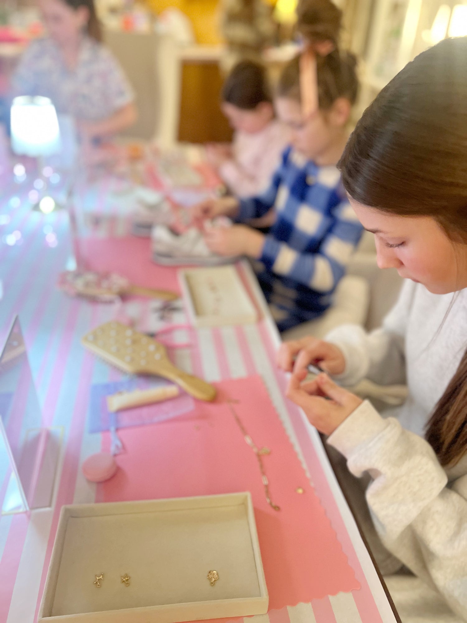 Craft-forward birthday parties with charm jewelry, lip balm bag charms, shoelace charms, patches on bags, and hairbrush glam-delivered to your door and picked up the next day.